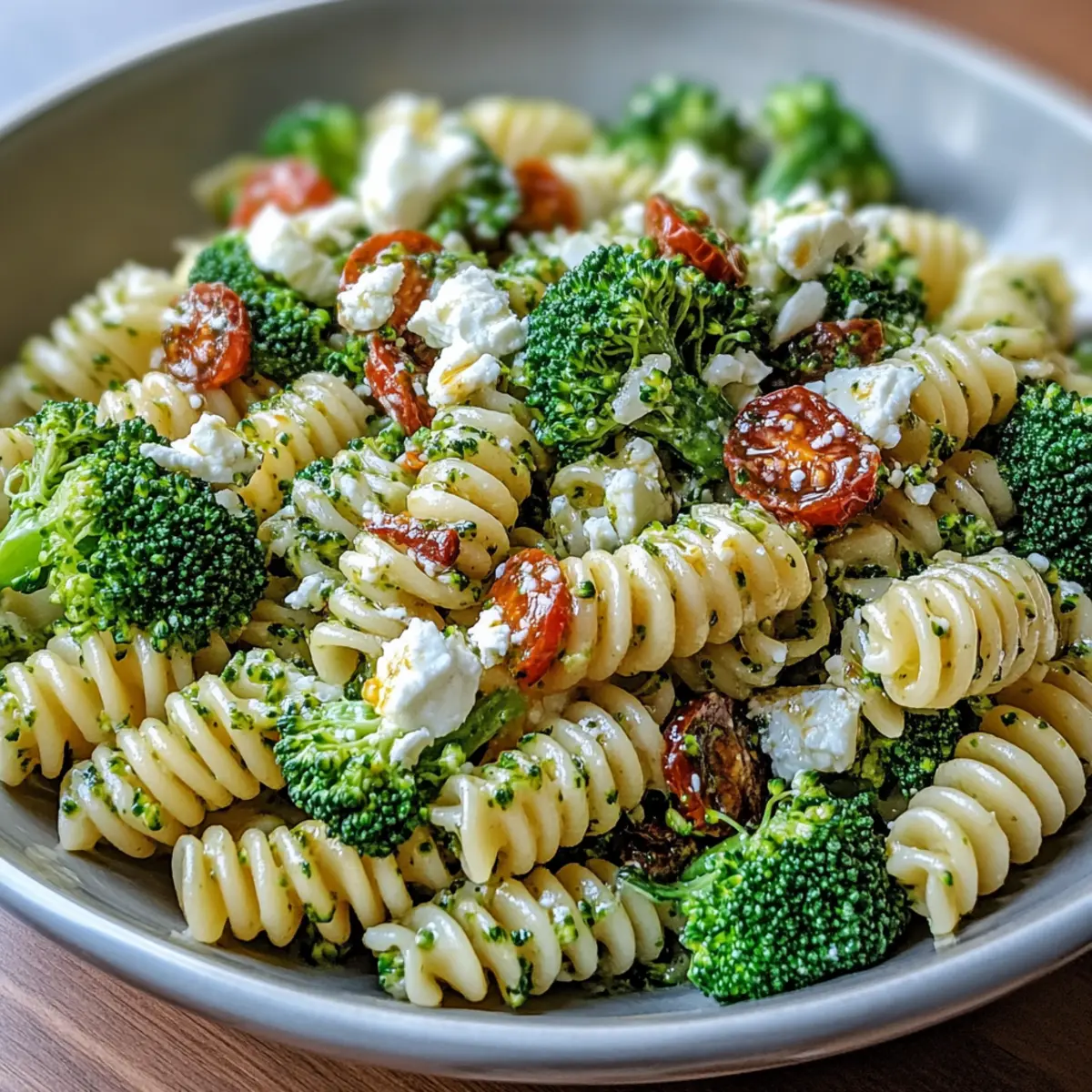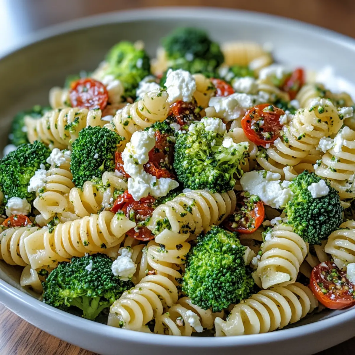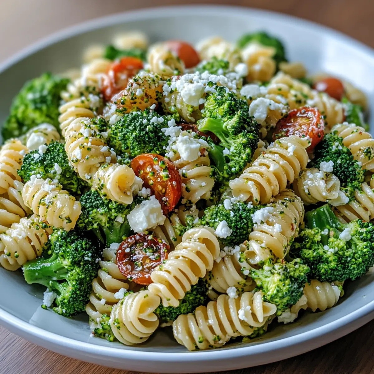 In a large mixing bowl, combine the cooled pasta, blanched broccoli, halved cherry tomatoes, and diced red onion. Gently fold in crumbled feta cheese to the mixture, ensuring everything is evenly distributed. This vibrant combination is the foundation of your Broccoli Pasta Salad, bursting with textures and flavors.