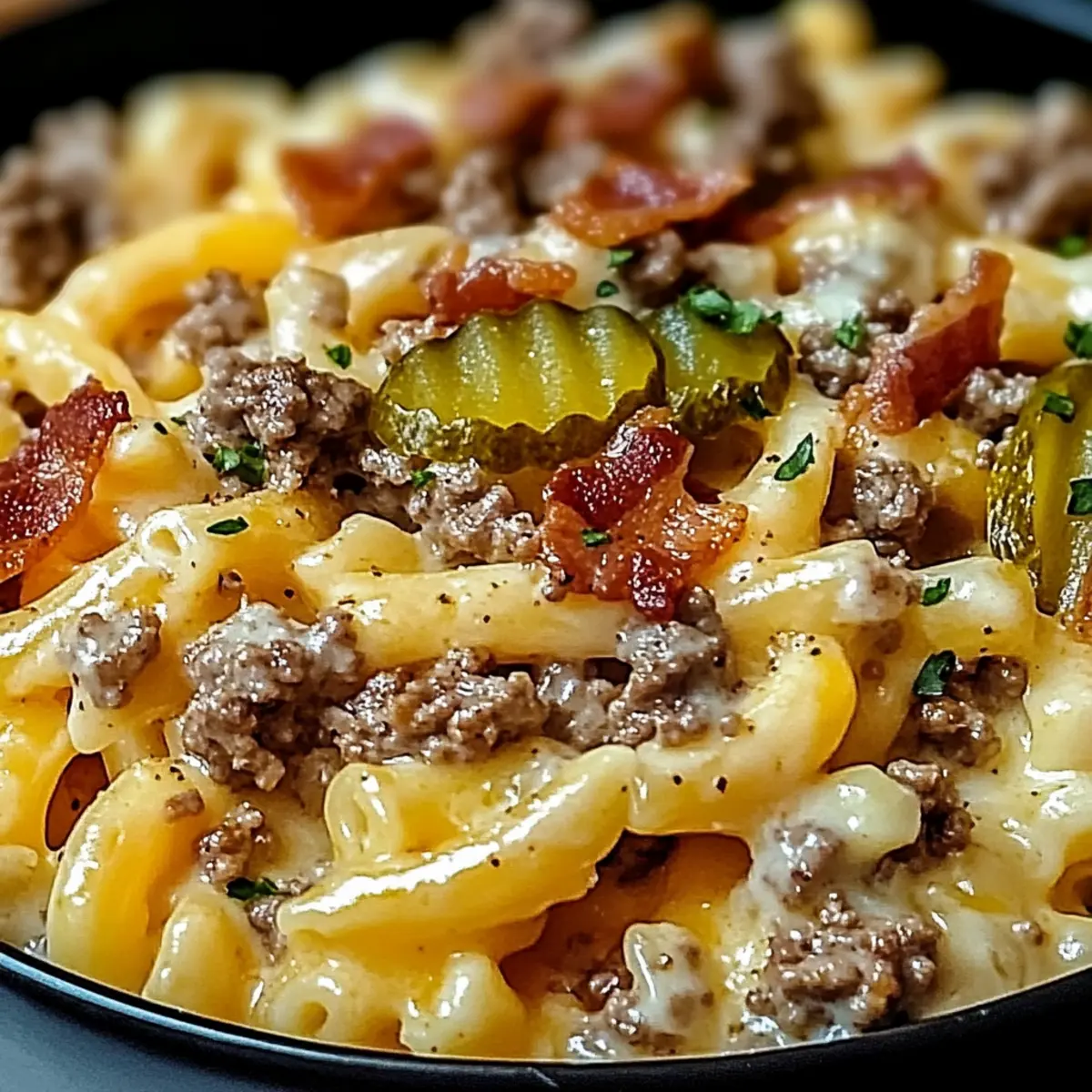 Once everything is well-mixed and creamy, remove from heat and top your Cheeseburger Alfredo Pasta with crumbled bacon and diced pickles for that classic cheeseburger taste. If desired, add fresh diced tomatoes or a handful of shredded lettuce to elevate the dish’s freshness and add a pop of color.