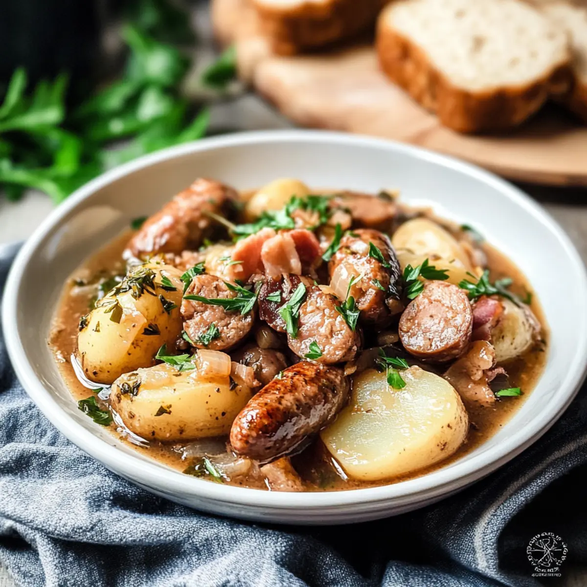- Layer the Ingredients: Layer onions, bacon, half of the parsley, half of the potatoes, browned sausage pieces, and remaining potatoes and parsley in the pot. Sprinkle with black pepper.