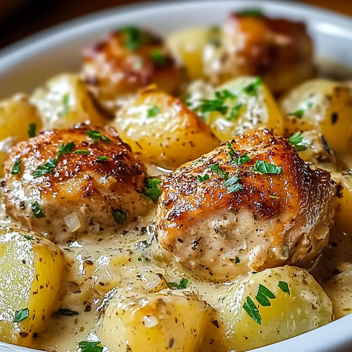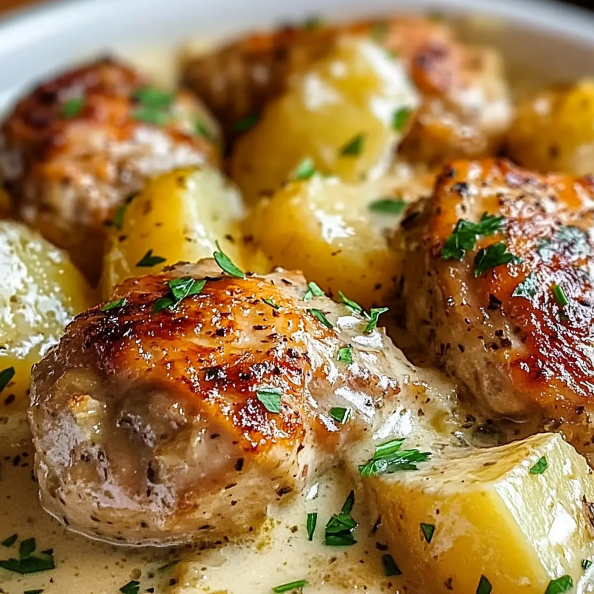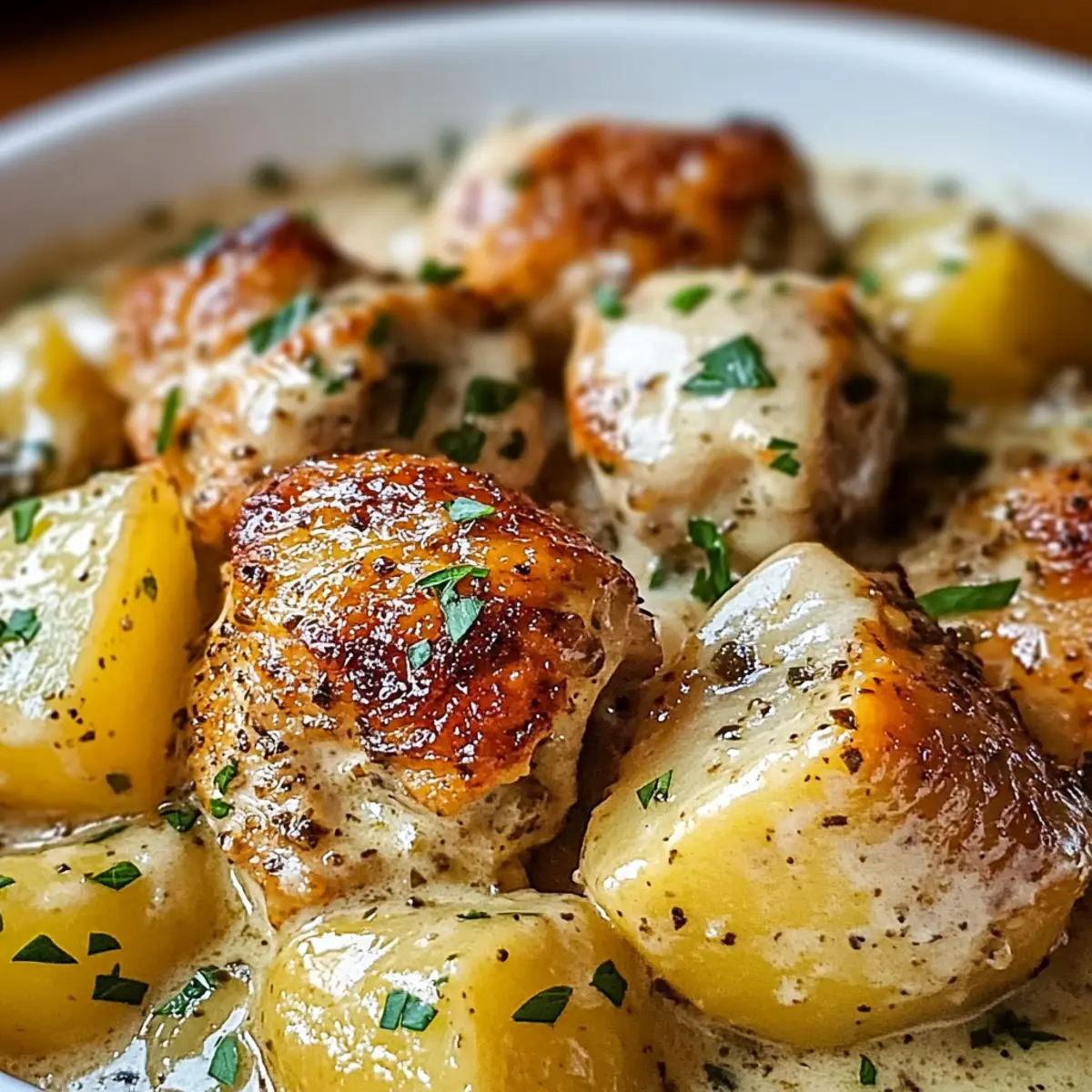 Rich, creamy goodness combines garlic and Parmesan, elevating chicken and potatoes into a mouthwatering meal.