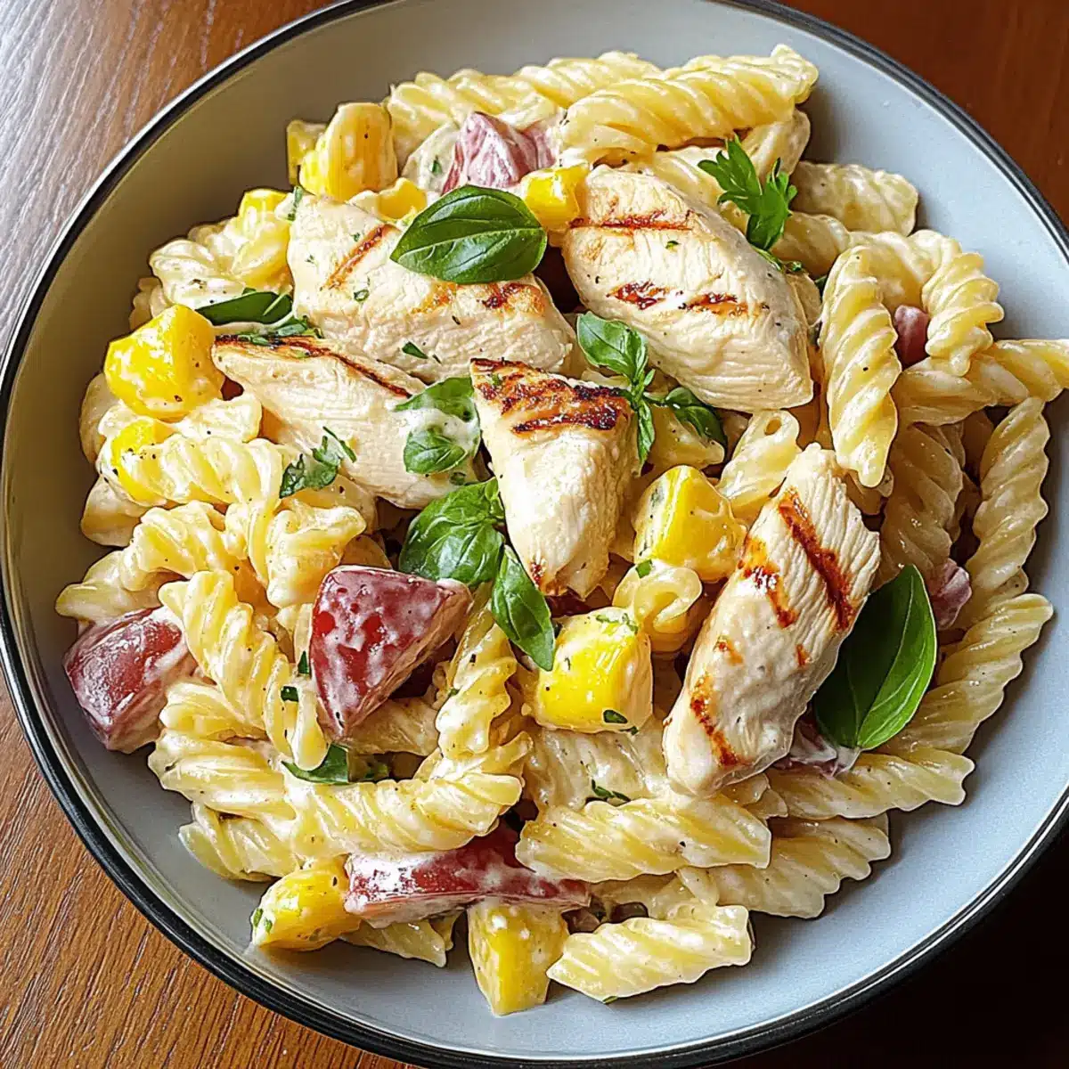 In a large mixing bowl, combine the sliced grilled chicken, cooled pasta, and a medley of fresh vegetables such as bell peppers and cucumbers. Drizzle the honey mustard dressing over the top, and gently toss everything together until the ingredients are well coated. This ensures that each mouthful of your Honey Mustard Chicken Pasta Salad is bursting with flavor.