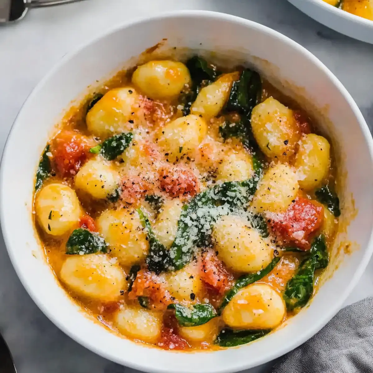 As I stirred the vibrant colors in my skillet, a wave of comforting aroma wrapped around me, instantly transporting me to an Italian kitchen. This One-Pot Creamy Tomato Spinach Gnocchi embodies everything I love about cooking—quick prep and the delightful ease of cleaning up after. In just 25 minutes, you’ll have a creamy tomato sauce enveloping tender gnocchi and fresh spinach, making it an ideal choice for weeknight dinners or intimate gatherings. The best part? It’s vegetarian, so everyone can indulge without compromise. Ready to elevate your dinner game with this simple yet satisfying dish? Let’s dive into the details and bring a taste of Italy to your table!