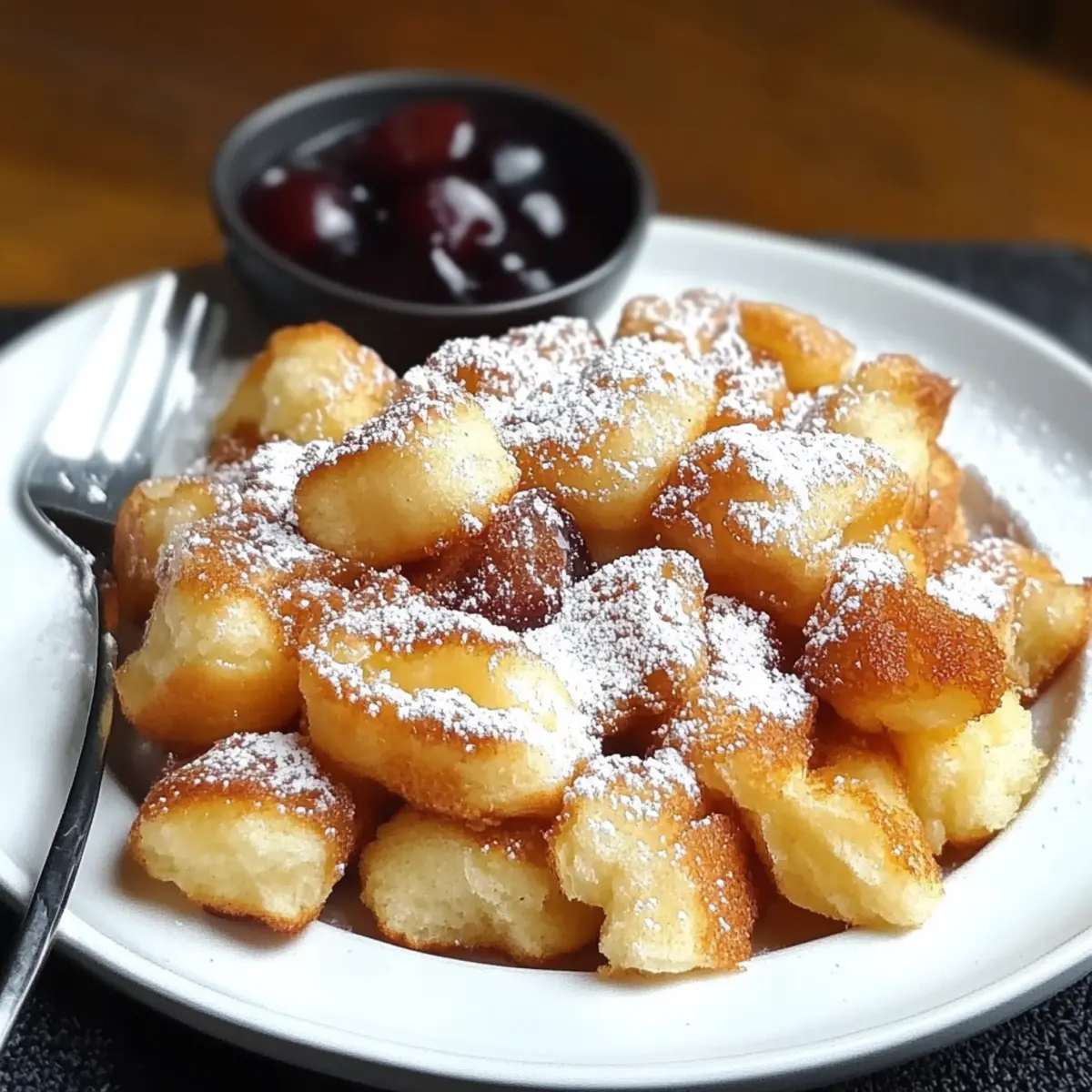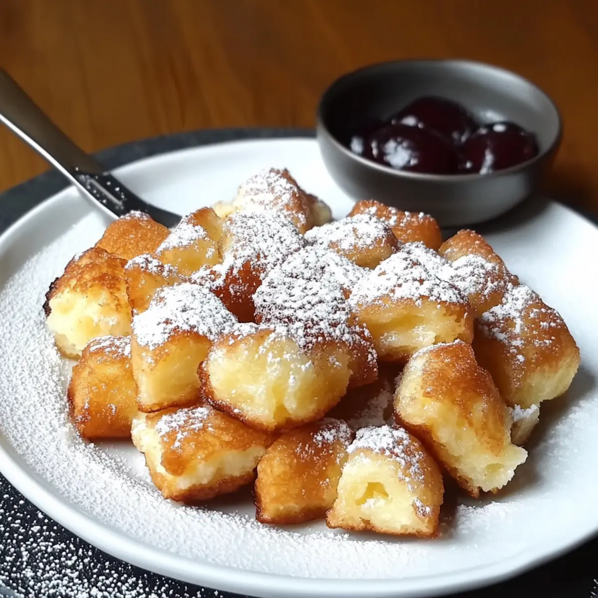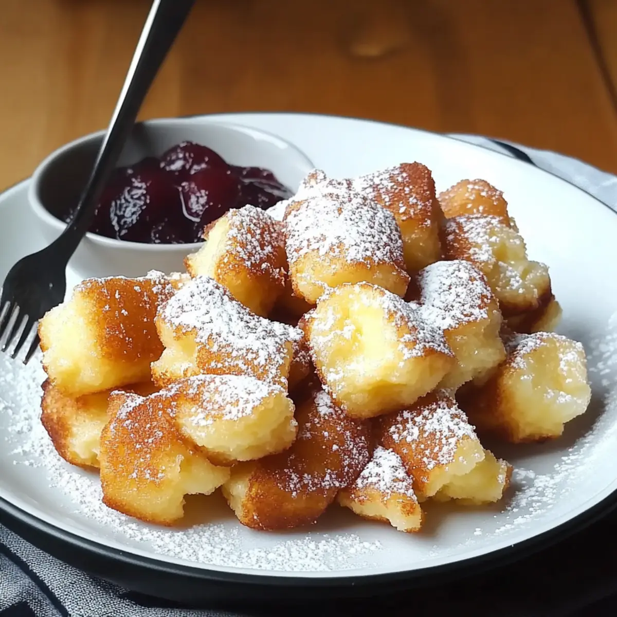 - Tear the pancake into bite-sized pieces and dust with powdered sugar. Serve warm with compote.