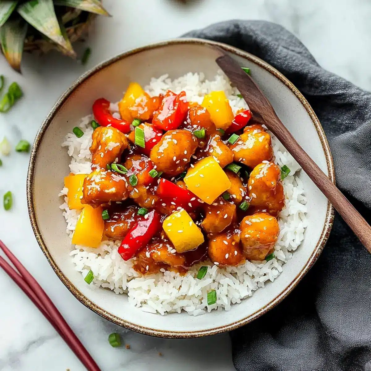 Colorful Presentation: The vibrant mix of red and yellow bell peppers along with pineapple makes this dish not only appetizing but visually stunning.