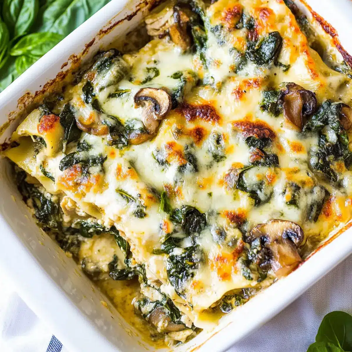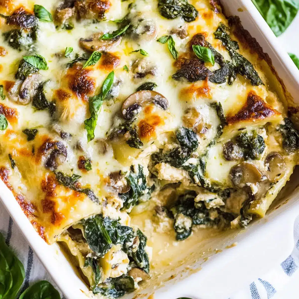 Comforting, creamy layers: This White Chicken Lasagna features a delightful blend of tender chicken, sautéed mushrooms, and fresh spinach, creating a dish that sings with flavor in every bite.